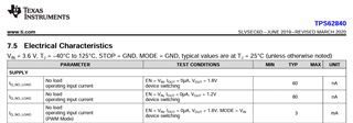 我想知道 TPS62840、 YBG (WCSP)封装对于10 -40 °C 的典型和最大静态电流是多少 、Vin=3.6V-4.2V、Vout=3.3V。