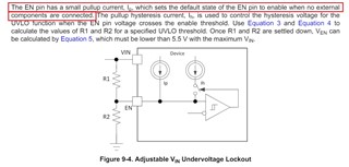 是的、我的意思是 在 VIN 和 EN 引脚之间添加一个电阻分压器、以确保 EN 引脚的电平处于规格范围内(-0.3V 至6V)