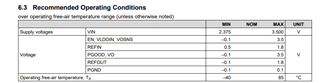 我们有一个设计的 VLDOIN= 1.0165V、低于1.1V 的建议工作条件、但最大输出电流仅为0.5A。 您能否评论一下是否存在任何潜在风险和解决方法? 因为这是一个持续的项目。 谢谢!