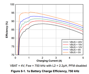 可用的输入功率是多少?  效率是 VBUS 与 VBAT 之间差异的函数。  Fsw=750kHz 且电感器为2.2 uH 时可实现最高效率  大多数客户会发现、IC 封装能够在4A 输出电流下实现热调节。