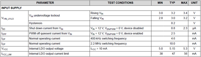 根据数据表、TPS923653的 VCC LDO 能够提供至少一个38mA。 我的 MCU (ATTINY806)消耗大约6mA 的电流、并且我已切换 LED、从而使 VCC 电压降至4.5V。 此外、当我尝试切换 TPS923653上的 PWM 引脚时、VCC 可下降至2.5V、从而导致电路故障、即使整个电路只是从 VCC 汲取10mA。