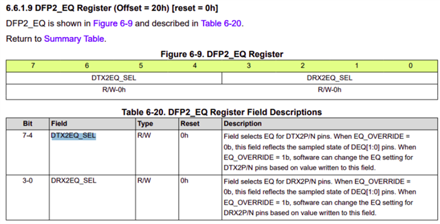 您可以通过将值写入相应的 I2C 寄存器来增大 EQ 增益。 例如、如果将0x13写入寄存器10h、则会将 UTX2设置为 EQ 设置#1、将 URX2设置为 EQ 设置#3