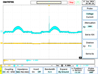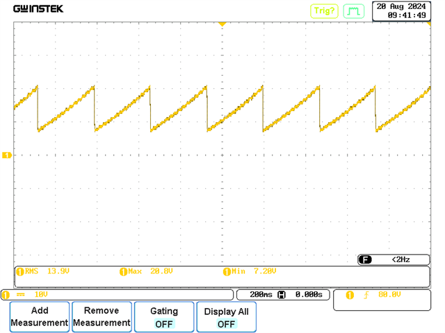 - VDD 电压在 UVLO 启动电平和停止电平之间上升和下降、表示控制器正在尝试启动但没有持续运行。
