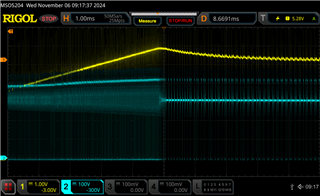 因此、当我打开您的设计的电源时、看起来设计以最大频率运行、并且电压过冲和频率正在降低。 这表明工作正常。