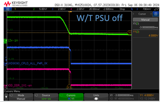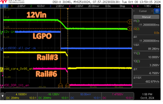 我还看到、LGPO 设置为在取消置位时具有96毫秒的延迟、这看起来比12V 从波形降至0V 所需的时间更长。 您可以尝试减小或移除此延迟、并检查 U909090_ALL_PWR_OK 是否在您预期的时候变为低电平。