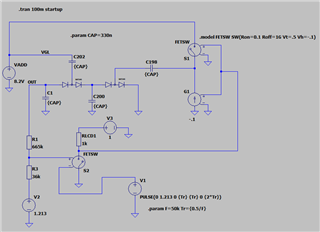 我正在对配置为双级负电荷泵的 TPS65150 IC 进行仿真。 遗憾的是、我无法找到此器件的官方仿真模型、因此我根据可用的数据表信息创建了一个简化模型。 但是、由于文档有限、我在使用"电流控制和软启动"模块时遇到了一些困难。