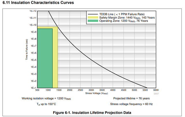 在第6页、我们可以看到6.7 "安全相关认证"。 根据 UL、该器件可用于1200VRMS 增强型绝缘最大工作电压。
