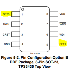 例如、上面列表中的第一个器件 TPS3435CAEBJDDFR 的超时为20ms、因此在采用正确的 SETx 配置时、看门狗超时可以是20ms、80ms 或160ms。