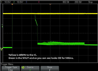 我有一个客户希望 使用 TPS281C100ADNTR 切换48V 输入电压。 该电路 的容性负载近似为20,000uF。 当我们打开这个开关时、芯片开启了、我看到 VOUT 上有48V 电压、但500ms 后、这种情况从示波器图中看不到。 这时芯片会非常快地发热。