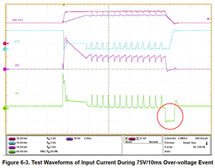 应用手册 SLVAFT6–2024年9月、图6-3。 输入电流测试波形在75V/10ms 过压事件期间、过压事件结束时显示大约-60A 的输入电流。 这是负电流的原因是什么、如何处理?