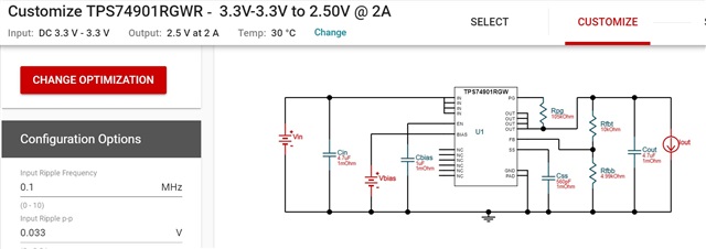 使用了 TI webench 电源设计器来设计采用 TPS74901的3.3V 至2.5V LDO。