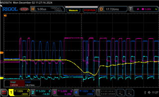 可以看出、当控制器启动新的突发数据包时、第一个栅极脉冲在软突发模式下启动、并且 在达到输入电压轨时 (我猜这是激活上部开关和设置死区时间所需要的)、开关节点似乎会钳位。 但是、当电压升高时、开关节点导数接近1V/ns、可以观察到开关节点第二次上升时、上侧栅极未导通、但在开关节点谐振一段时间后激活(上开关的延迟会变化、但在硬开关条件下似乎总是发生)。 在这种行为之后、我总是得到 一个5us 长的低侧栅极脉冲、经过一些周期、它似乎恢复到正常运行。 我已经看到、如果我提高 BMT 电平、该行为将消失、这可能是由于突发封装开始时开关节点上的 dv/dt 电压更高所致。 我担心的是、我可以听到这些开关事件、并且我还了解 、这会在开关上施加不必要的应力(5us 脉冲使谐振电容器放电、从而导致不必要的高谐振电流事件)。 我可以 通过增加突发模式阈值来解决此问题、但那样我会影响设计中的非稳压辅助输出的纹波和交叉调节。