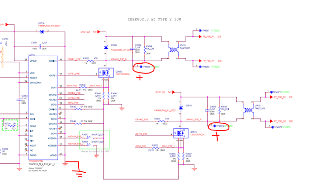 对于 PD、您可以 VSS 在 TPS2373-4的引脚或安装的测试点/元件上测量 VRTN-TPS2373-4和 VDD VSS。 要测量电源接口电流(IPI)、您通常需要切断 CAT5以太网电缆。 尝试使用电流探头选择 PR12+PR45或 PR12+PR78、直到获得4线对电流(与 PR36+PR45或 PR36+PR78相同)。