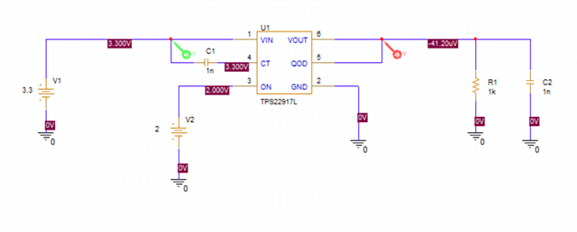 我将尝试使用 TPS22917来模拟一个电路、但在最基本的实现中、该 TPS22917未被打开。 我已完成设置、无法理解输出为什么继续保持低电平。 我的电路和结果如下所示。 可以有人建议我使用零件和模型的方法吗?