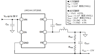Vin=2.2uF 25V、L=10uH (+/-20%)、Cboot=0.1uF 16V、Cout=22uF 25V、Rfbt=56.2k Ω、 Rfbb=3.16k Ω