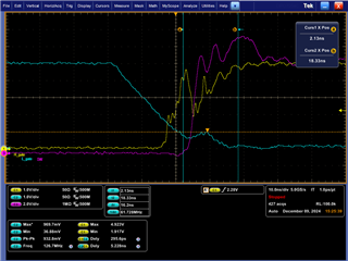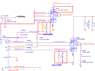 当 LS MOS 关闭-> HS MOS 开启时、我测量 H/L 侧 MOS 栅极波形、观察到它完全重叠