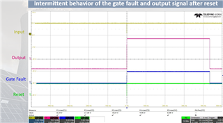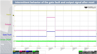 在电气测试中、我们注意到下部栅极驱动 IC (U4)存在间歇性栅极故障和输出信号。 来自 CC 的复位信号能够每2.8秒清除一次、但它在未指定的时间间隔(间歇性)后再次激活、DESAT 输入端无电压。
