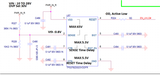 我建议使用 TPS3762D02OVDDFR 或 TPS3760E012DYYR 。 他们可以替代您的电阻器、电容器和 FET。
