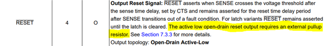 TPS3762D02OVDDFR 具有锁存功能。 这意味着引脚4 (RESET__)将保持有效状态、直到 在 BIST_EN/LATCH_CLR 引脚上检测到逻辑高电平输入、因此不应将其悬空。 如果您不需要此锁存特性、那么您应该考虑我推荐的另一款器件  TPS3760E012DYYR、 它具有与 TPS3762相同的功能、只是没有 BIST 和锁存功能。