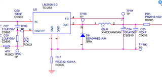 3 μ s 我想、这是不是由电感 L1引起的。 实际使用的电感器是47 μ H、额定电流为1.55A、但 TI 的产品说明书建议使用33 μ H、而且它的额定电流是否必须满足3A、此时我的后端的实际功耗仅为200mA。