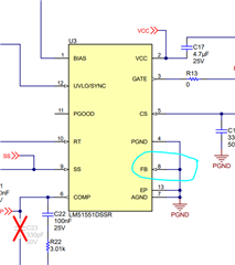 FB 引脚仅在 SEPIC 和升压拓扑应用中用于反馈。 即使在 PMP22800参考设计中、FB 引脚也按如下所示接地。