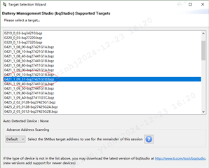 我们安装了 bqStudio 工具并选择了我们要使用的电量监测计、如下图所示: