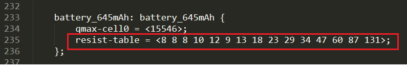 我在 BQ27421驱动程序代码、的 DTS 中看到"bat-resist-table"配置项、如下所示: