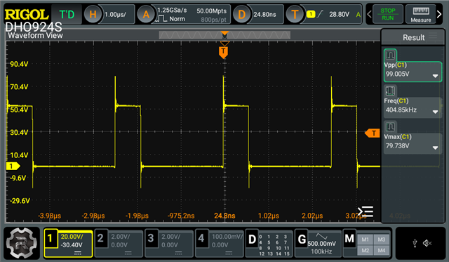 我在 开关节点上看到很大的电压尖峰。 这是采用52V 输入电压和12V 10A 输出电压(具有电阻负载)时的情况。 查看照片: