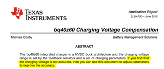使用 BQ40z60 EVM 进行测试时、我注意到充电结束电压和反馈引脚电压高于预期。