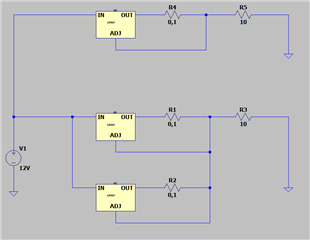 我想知道是否可以增加电流。 我执行了 SPICE 仿真、并且根据仿真、应将电流相加。 我还构建了一些电路、如这两个组件的数据表中所示、但电流与一个稳压器相同、即使使用了两个稳压器也是如此。