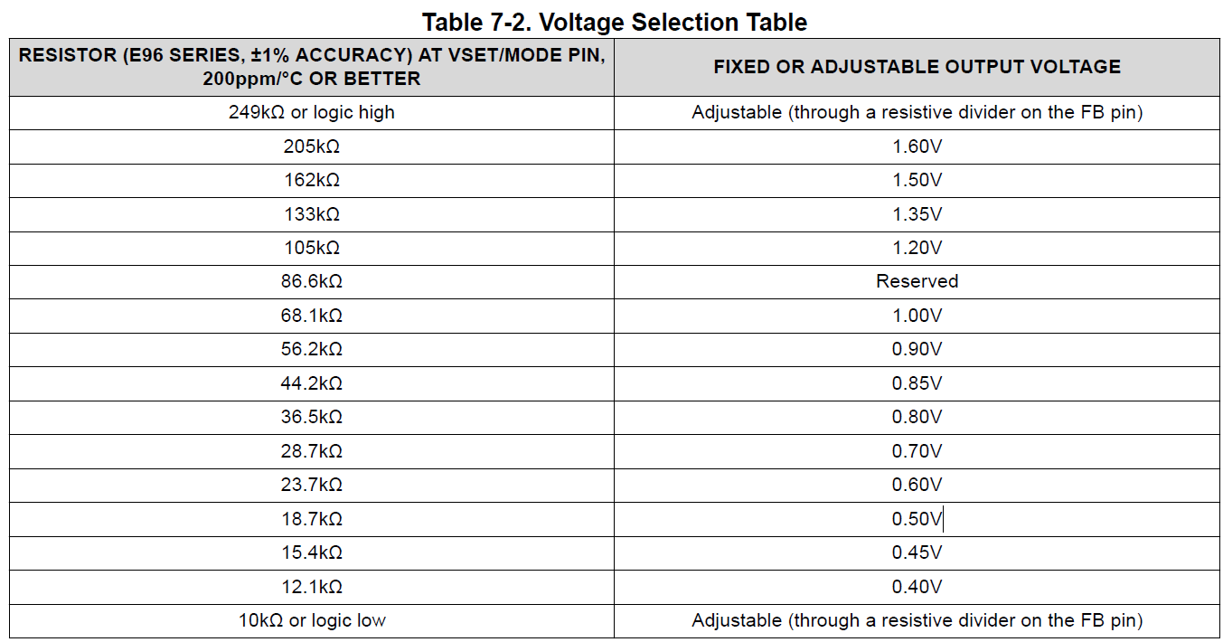 根据数据表中 VSET/MODE 引脚的定义、要输出0.5V、您需要通过18.7kΩ 电阻将该引脚拉至接地。 启动后、如果要将其设置为强制 PWM 模式、需要将此引脚上拉至高电平。