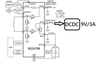 我使用的是 BQ25798 在将直流/直流转换器连接到 SYS 引脚以提供9V/3A (27W)输出的应用中为 IC 充电并计划实施该器件。