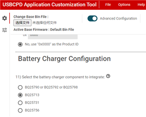 我想在 USBC 应用程序自定义工具中确认 TPS25751D 是否具有适用于 BQ25723的电池充电器配置? 目前没有适用于 BQ25723的选项、如下图所示。
