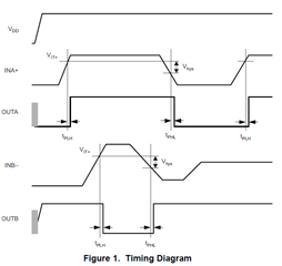 INA+引脚用于监视 UV 事件、如果有 UV 事件、OUTA 将为低电平。 INA-引脚用于监视 OV 事件、当 INA-上的电压高于阈值时、OUTB 置为有效。 请选择7. 详细说明以查看预期的 OUTA 和 OUTB 行为。