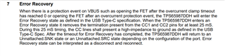 我们在 TypeC State 寄存器中提供了 TypeCPortState 字段、以报告器件是否处于 ErrorRecovery 状态、但这需要设置 MCU 来监控和轮询 I2C。