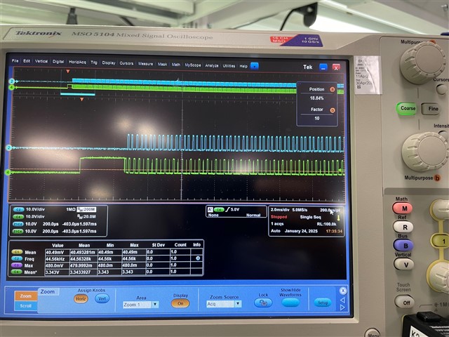 Alex Drobyshev 近期发布的 LLC 转换器的类似原理图、不同之处在于我使用单独的交流电压源进行 HV 启动、但尽管如此、我的 UCC256601从未启动。 我可以看到、VCC 的引脚12上的电压为7.9到8VDC (EVM 显示为12VDC)、而 V5P 的引脚8上没有5VDC。 使用示波器、我只能看到1V 方形脉冲、脉冲长度为120ms、在用于 V5P 的 PIN8上的周期大约为1200ms。 当我尝试将隔离式变压器提供的交流电压降低到高压的引脚1时、这些脉冲的频率也会增加、但其幅度在1V 电平下保持不变。 VCC 电压不会改变、保持在大约8VDC 电平。 当电源关闭时、令人惊讶的是、这些脉冲会持续很长时间、约10-20分钟。 以极低的消耗率进行一些大容量放电? 我检查了连接到 V5P 的所有元件、启动期间任何东西都不会使其过载。 对于上/下、TSET 电阻器为1000K/200K。 LL 电阻器分别为600K/150K。 C10为4.7 μ F。 C13是1uF 陶瓷电容器。 OTP 编程电路未连接到 Alex 所示的 Vin、而是连接到 Vcc、如 EVM 原理图中所建议。 什么可能会导致 HV 启动?