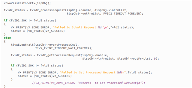 在您的代码中,我看到调用 chwaVissRestoreCtx API 时传递给它的 ispObj ,但在我们发布的代码中,这个 API 是用 vissObj 调用的。 那么、 您是否再次更新了这个代码? VISS 节点中有什么所有变化?