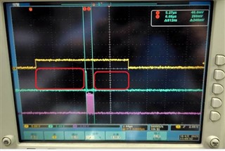 如下图所示、黄色为 SPI CS、粉色为 SPI CLK、蓝色为数据