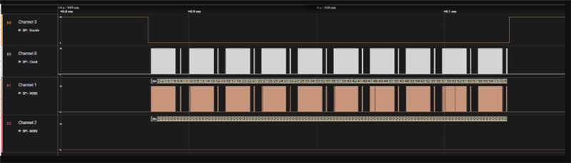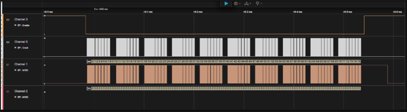 发送的字节有一个芯片选择、这已使用逻辑分析仪通过代码和波形确认。 因此、您可以看到以下波形片段: