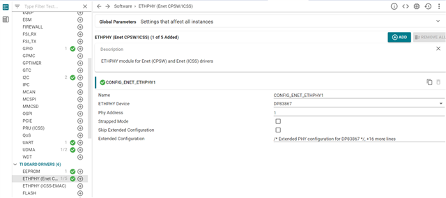 3.将以太网驱动程序连接到 DP83867并将地址设置为1。