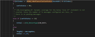 在函数 CAN_writeGetFreeMsgObj 中、当确认发送 BF 是否空闲时、检查 TXBCF (取消发送完成)寄存器而不是 TXBRP 寄存器。