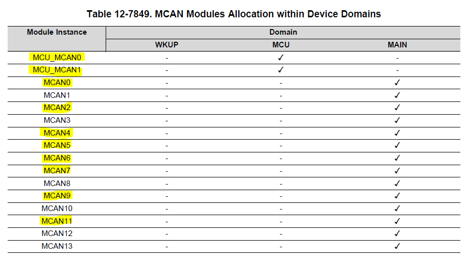 TDA4 SoC 支持16个 CAN、即 SoC 中有16个 MCAN 控制器- MCU 域中有2个、而 MCU 域中有14个