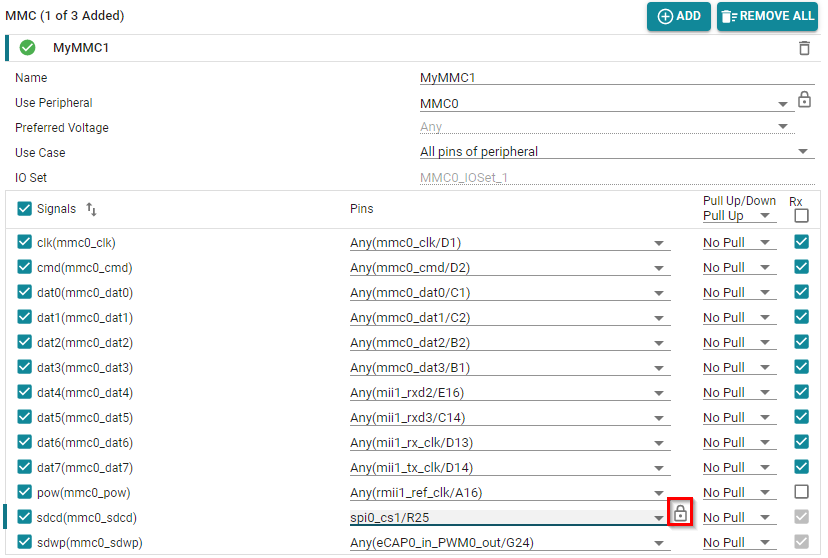 但是、您可以覆盖自动定位功能、并强制工具将信号锁定到特定的引脚。 我在下面的屏幕截图中展示了如何执行此操作、这里的关键是我手动将 mmc0_sdcd 信号引脚设置为 spi0_CS1/R25、并确保符号显示为已锁定 (与解锁相反、解锁允许工具更改分配给该信号的焊球)。