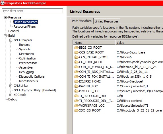 我有一个已定义的变量: com_TI_pdk_install_DIR、指向 C:\ti\pdk_am335x_1_0_5。 但这并不是头文件所在的位置、而是更深的位置。 然而、为了使事情复杂化、 "预定义变量"(或任何 CCS 调用它的变量)无论如何都不在我的包含路径中。 我的包含路径中唯一的一个是 "${CG_TOOL_INCLUDE_PATH}" 、只是它未在"链接资源"选项卡的任何位置定义。。。????? 这里发生什么事了???