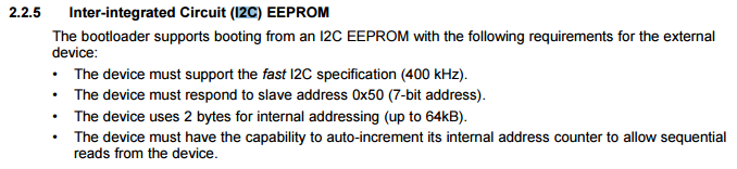 只要您坚持正确的 I2C 协议标准、对于引导加载程序使用 I2C 没有任何特殊之处。 请参阅 位于 http://www.ti.com/lit/an/sprabd7c/sprabd7c.pdf 的 C5504引导加载程序应用手册、以下是一些需要遵守的 I2C 特定要求。