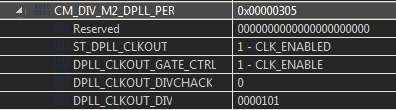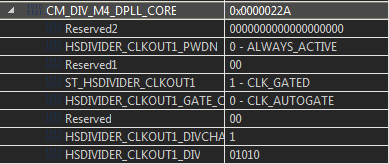 这个没有任何意义。 如果 CM_DIV_M4_DPLL_CORE 被选通、那么我的很多其他外设都不应该有一个时钟、这些外设像 GPIO、UART、I2C 等一样工作(根据时钟树工具)