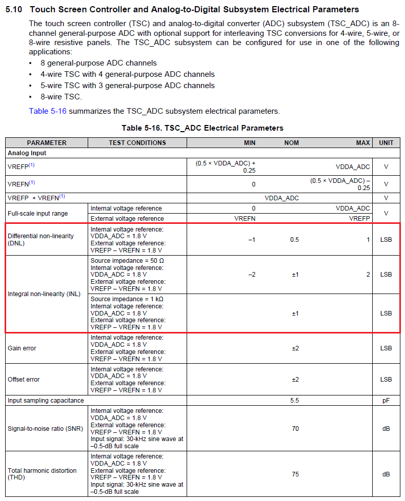 尊敬的 Sitara 支持团队:关于 ADC 精度、 数据表中规定了 INL 和 DNL、如下所示。