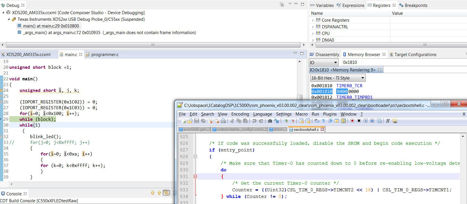 如果我删除了该命令的一些-reg 配置、则它可以引导并运行到死循环。 但外部存储器值错误、因此如果我移除死循环、它将会运行得一团糟。 观察 EMIF 寄存器0x1014、0x1015的值与配置的值一致。 因此、我认为引导加载程序跳转到应用程序过程是可以的、但外部存储器配置不正确、因此其中的值是错误的。