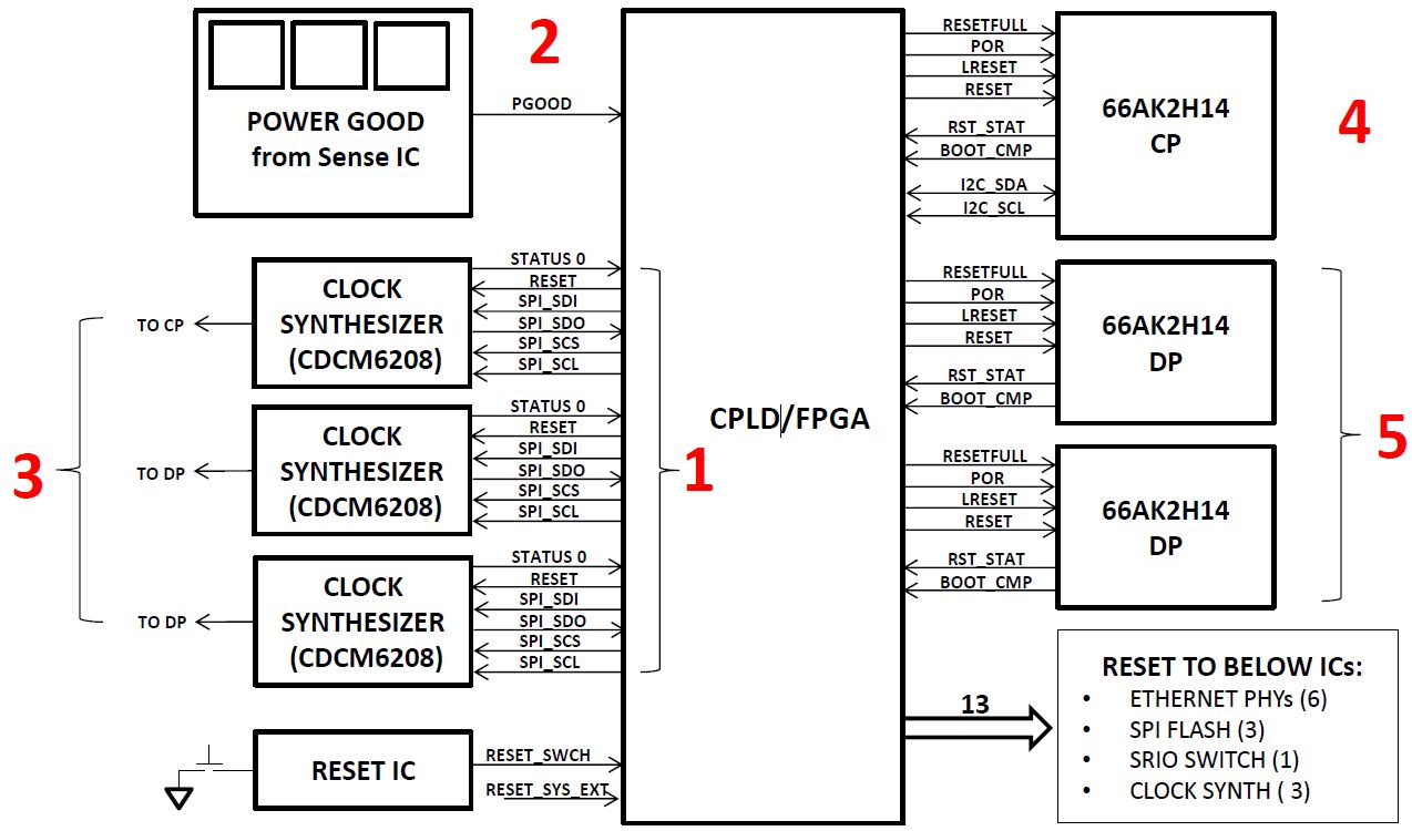 我计划在单板上使用3个66AK2H14 SOC。 其上电和启动将由 CPLD 控制、如下所述: