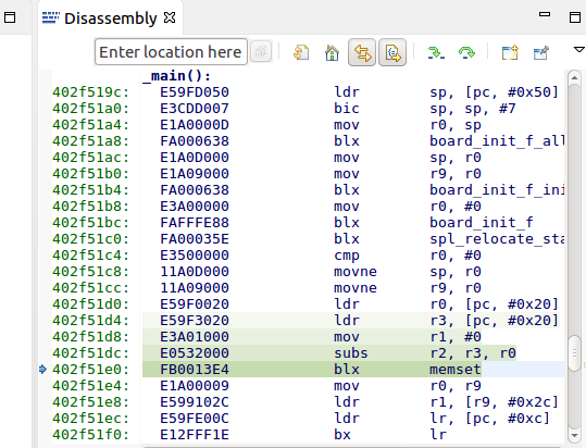 您能否在'blx memset'后在指令上设置断点并点击 run? 您是否仍然遇到错误? 这是定制板还是 TI EVM?